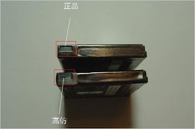 2、原装电池在与手机结合的凹槽处有1-1 、1-2字样,数字高度在1-2毫米间,而且数字颜色发亮。组电、假电凹槽处一般没有数字,即便有,数字的高度也会明显大于2毫米 ;